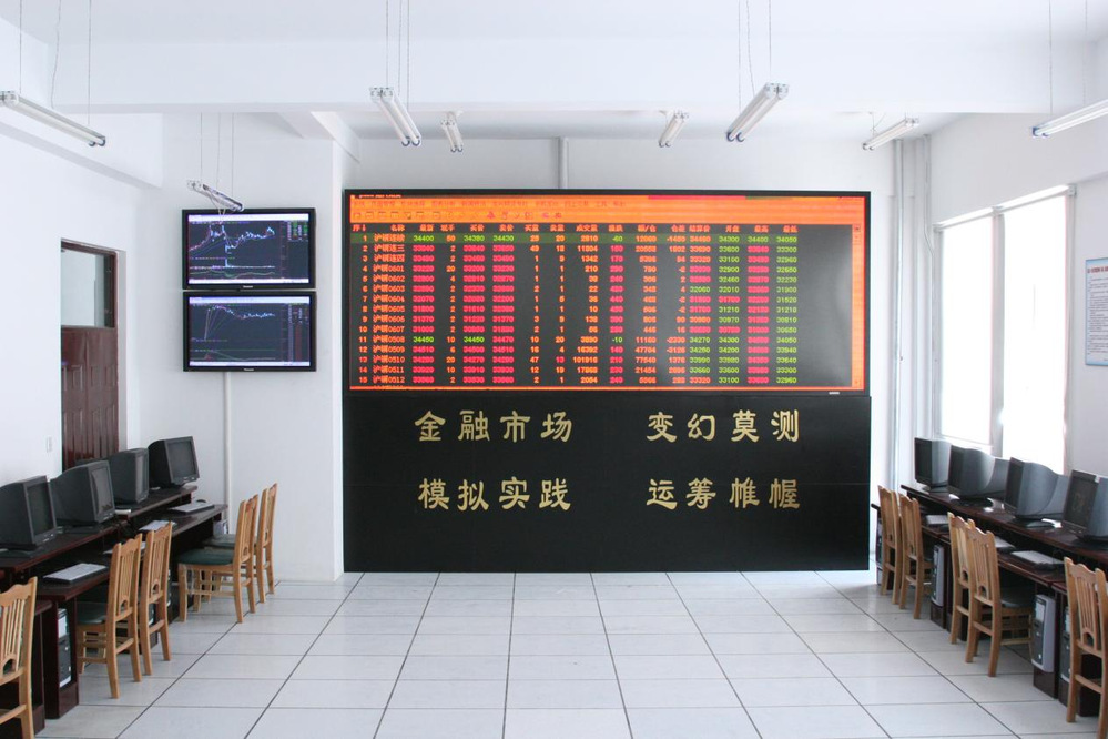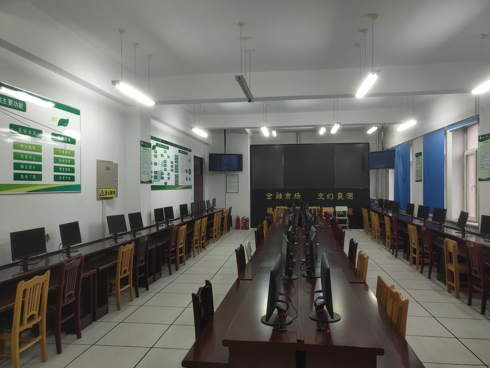 金融与财务决策实验室创建于2003年,面积103平方米,配有54台计算机,一面LED(6.3平米)大屏幕、两面PDP等离子显示器及一套卫星接收系统等硬件设备。