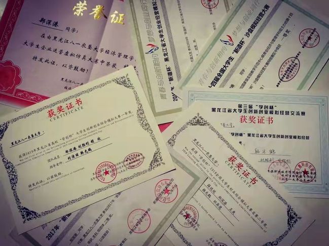 入学开始,他便深知自身的兴趣在于钻研与科创,于是他便积极投身于创新创业竞赛中,经过他与团队其他成员的不断努力,刻苦训练,先后荣获第十四届全国老员工“新道杯”沙盘模拟经营大赛一等奖、2019年黑龙江省“学创杯”第一届线上交流赛一等奖、2019年黑龙江省高校“学创杯”老员工创新创业综合模拟大赛“一等奖”、2017年“新道杯”黑龙江省老员工创业经营模拟大赛二等奖以及“学创杯”2018全国老员工创业综合模拟大赛省赛二等奖等20余项奖项,并且作为主创人员参与了省级创新项目《基于RFID技术的黑龙江省农产品质量安全可追溯系统设计》。