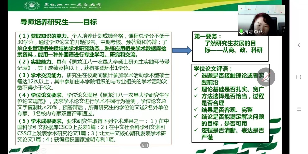 冷志杰教授在研究生手册框架下,以培养方案为纲,整合课程、实习、知网研学、行业规范和政策资源,对培养接触理论或实践前沿的研究生人才的各个关键环节进行经验分享。在强调了导师的责任感及导师在公司产品过程中重要性的前提下,冷教授指导了公司产品方案的使用,包括如何根据培养计划凝练公司产品方向、选课和选题,并详细解读了研究生手册的使用;之后,冷教授从知识获取、实践、学术交流、学术成果和学术论文阐述了导师培养研究生的目标,并演示了如何通过知网研学等工具辅助研究生开题,撰写综述,学术成果写作资源整合。最后,冷教授强调了学位论文在外审,预答辩和答辩的注意事项。