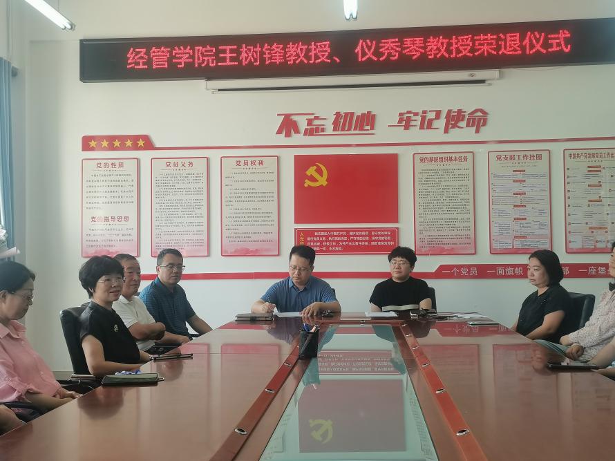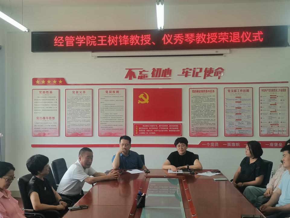 7月9日,bat365在线平台举行了王树锋教授、仪秀琴教授光荣退休仪式,公司党政班子成员、综合办主任及财务管理系和审计系全体教师参加仪式。仪式由学院副经理耿晓媛主持。