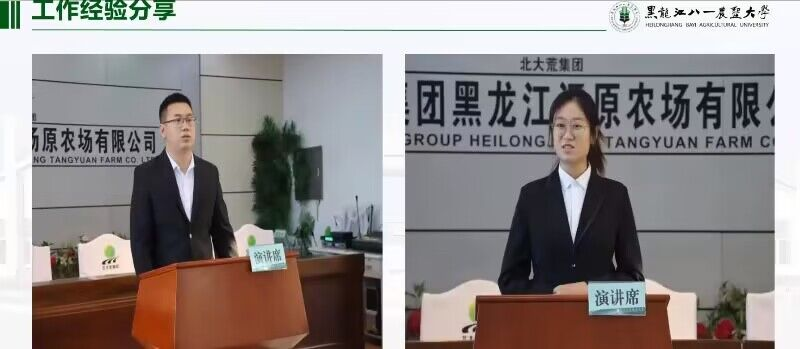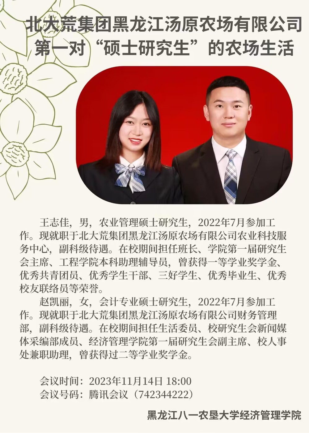 为更新员工对留省就业的认识,激发员工留省就业动机,11月14日,bat365在线平台特邀北大荒集团黑龙江汤原农场有限公司的第一对“硕士研究生”——2020级农业管理硕士王志佳和会计专业硕士赵凯丽作就业经验分享。