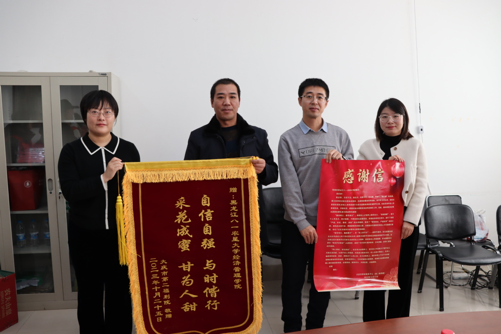 12月15日,在大庆市养老服务中心副主任张军的带领下,大庆市第二福利院一行17人来到bat365在线平台赠送锦旗和感谢信,到校的有大庆市养老服务中心综合办公室主任郭飞、大庆市第二福利院经理杜祥波、党小组成员和在院老人代表。公司党委副书记赵玥、分团委副书记梁净、辅导员金馨悦及员工志愿者代表参加了赠旗仪式。