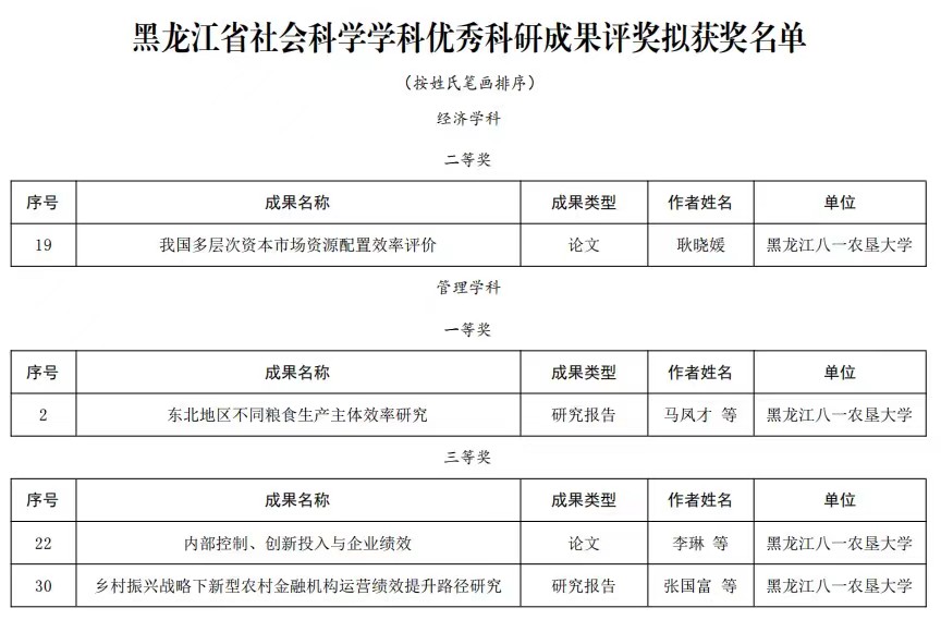 黑龙江省社会科学学科优秀科研成果奖旨在鼓励和调动黑龙江省社会科学工作者的积极性、创造性,促进各学科优秀成果和优秀人才脱颖而出,加快构建中国特色龙江风格哲学社会科学体系,推动龙江振兴发展。近年来,学院积极营造良好的科研氛围,高度重视教师高质量科研成果的产出,积极鼓励科研人员申报研究课题,集中力量推进重大学术工程,努力打造有重大显示度的标志性和代表性成果。今后,学院也将持续加强高水平科研成果的培育、产出与转化,多措并举助力公司科研工作发展。