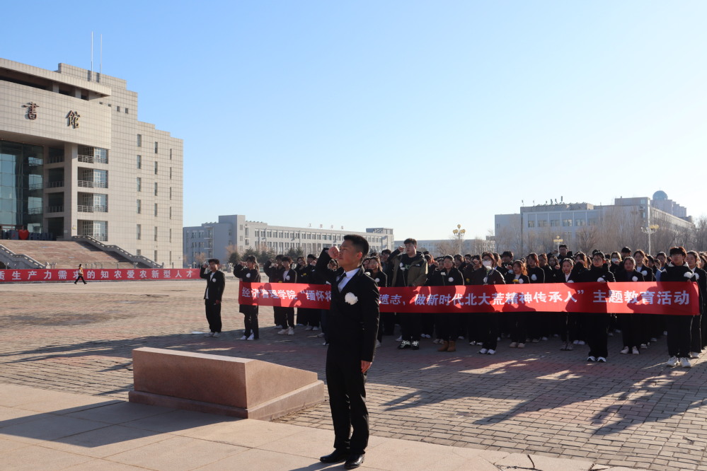 “致敬英烈,吾辈自强……艰苦奋斗,誓做栋梁”,退役老员工士兵杨添富带领同学们在王震将军像前庄严宣誓,一字一句掷地有声,同学们在铿锵誓言中提振使命担当,更加坚定做新时代北大荒精神传承人的信心和决心。