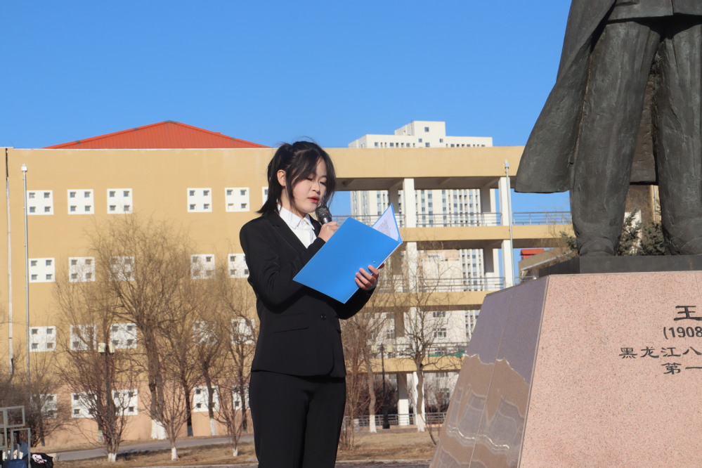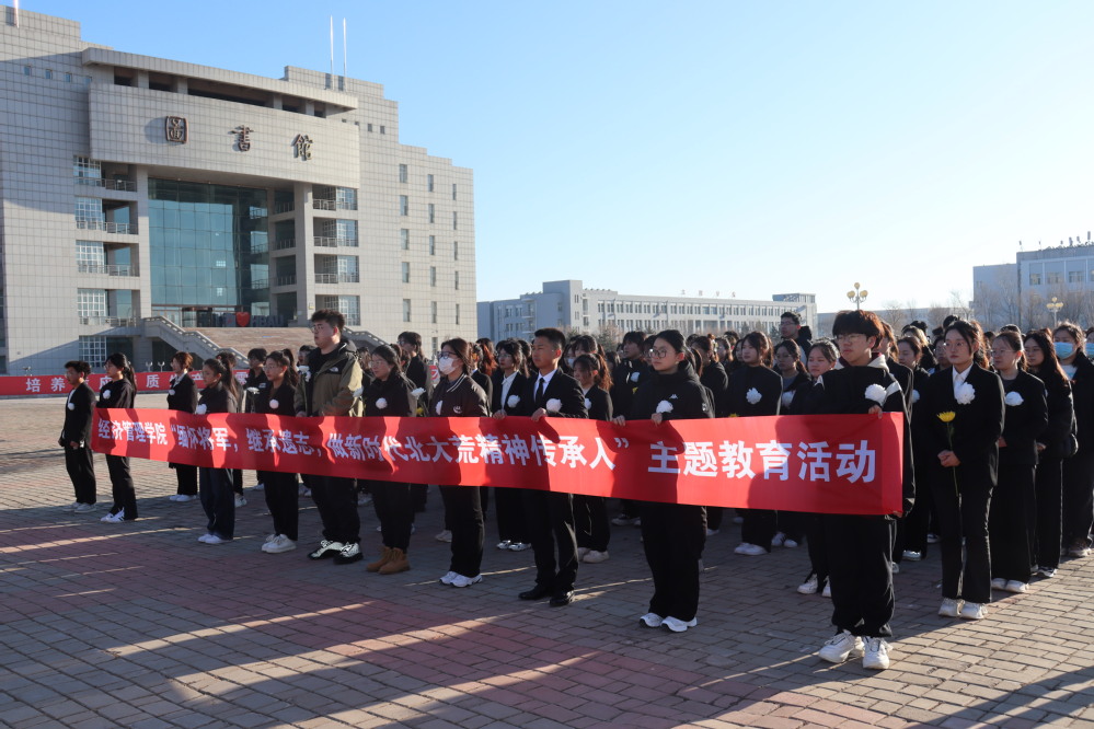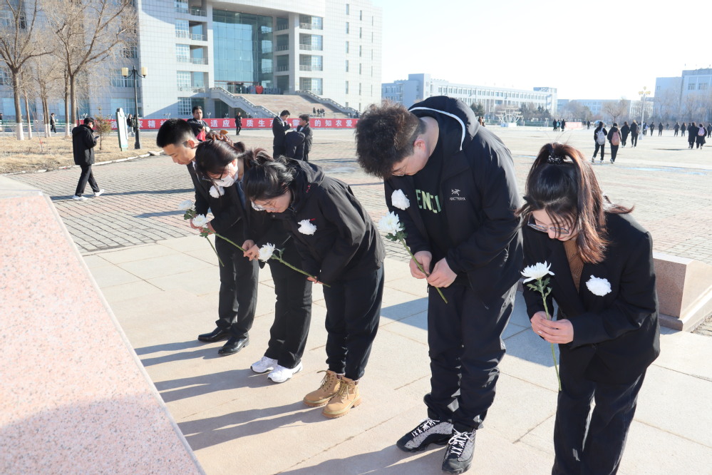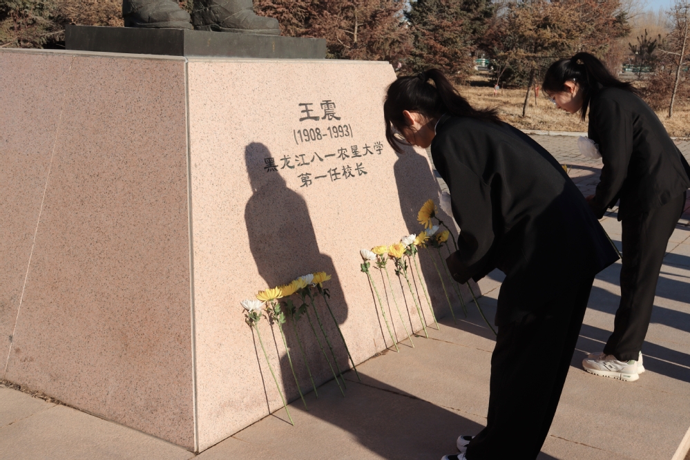 师生胸戴白花、神情凝重、整齐列队,在王震将军像前齐唱校歌,缅怀王震将军丰功伟绩,追思老一辈北大荒人奋勇拼搏、砥砺前行的光辉业绩和崇高风范。歌声停止,师生静默肃立,低首默哀3分钟,向王震将军像敬献鲜花,表达深切的怀念和崇高的敬意。