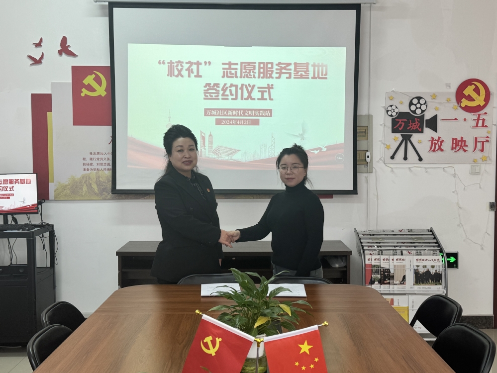 为构建校社共建的良好教育格局,促进校社资源共享、优势互补,4月2日,bat365在线平台与黎明街道万城社区签订志愿服务基地共驻共建协议,万城社区党总支书记王世君及社区工作人员、bat365在线平台青年志愿者协会指导教师金馨悦及员工志愿者代表参加签约仪式。